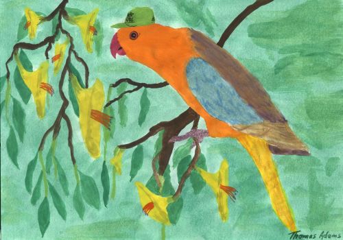 Der Orange Fruchtsittich bei gelber Trötenorchidee, Kinderbild-Remake (24.4.2014) 29,7 cm x 21 cm. Das einzige Sittichbild, welches ich von meinen Kinderbildern hatte, wo aufgrund der Farbgebung, keiner unserer Wohnungs-Wellensittiche zu sehen war. Außerdem noch mit Schirmmütze. - Sittichart, sowie die Pflanze des Bildes, sind natürlich Phantasiekreationen. |