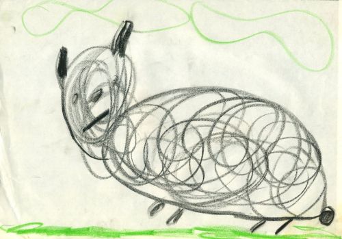 | Moppelchen, Kinderbild-Remake (17.7.2015) 29,7 cm x 21 cm. Beim Original konnte man sich eigentlich nicht einmal ganz sicher sein, um was für ein Tier es sich überhaupt handelt. Beim Remake entschied ich mich für eine Mischung aus zwei jungen Hunden, von denen einer ein Mops war. |